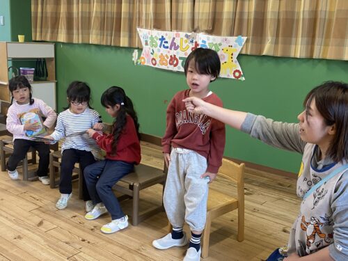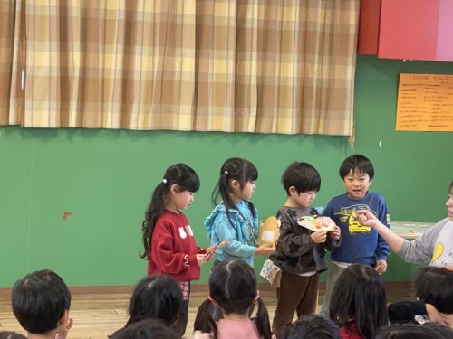 幼児クラスの誕生会では、名前を呼ばれると誕生月のお友達が前に出てきました。