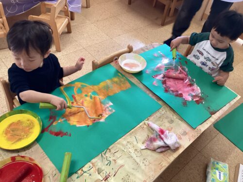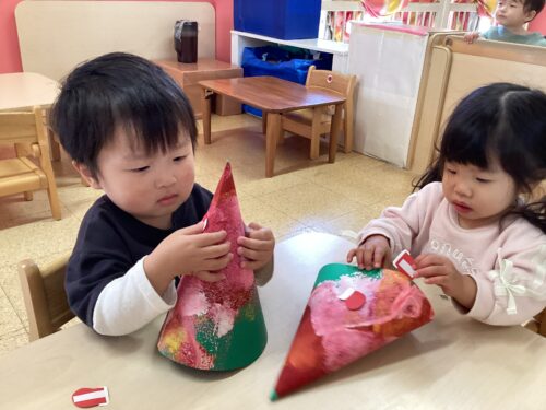 そんな中、クリスマス会で身に付けるクリスマスツリーの帽子の製作をしました✨ツリーは馴染みのある物なので、より一層やる気満々の子どもたち。ローラーを使い、緑の画用紙に模様を付けました!赤色、白色、黄色の色が混じりとても綺麗です🥰
