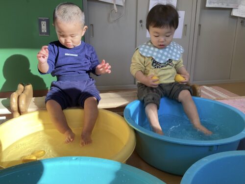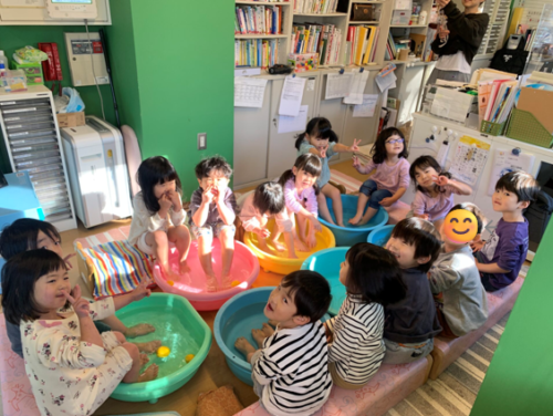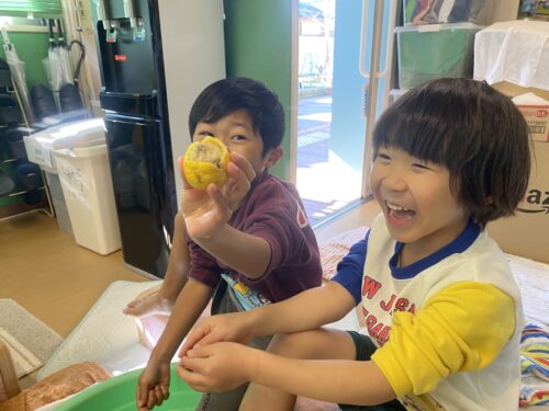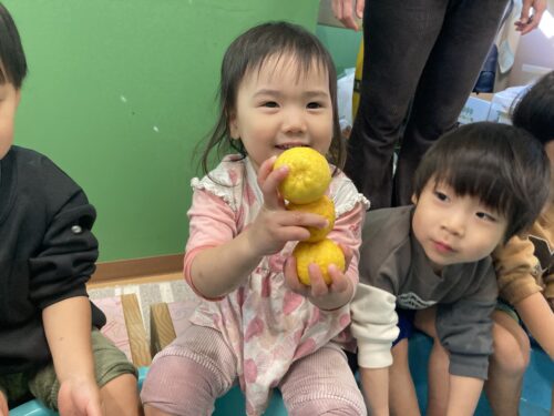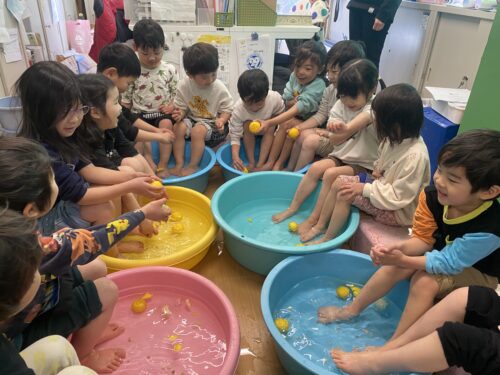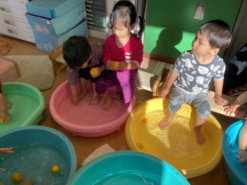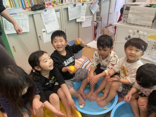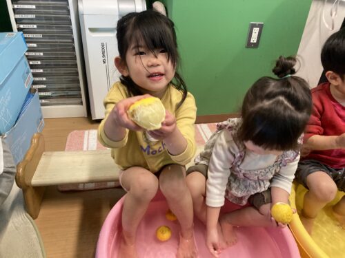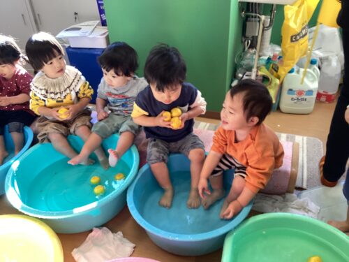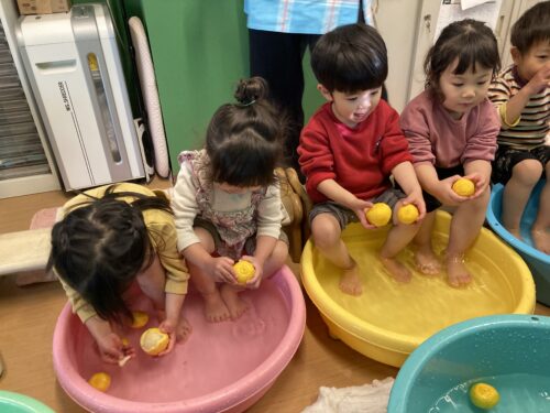 伊丹くじら保育園では恒例になってきている、おすそ分けして頂いた柚子を使って、足湯を楽しみました♪