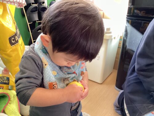 次に園庭で遊んだ後に来てくれたのは、うみ組(0歳児)