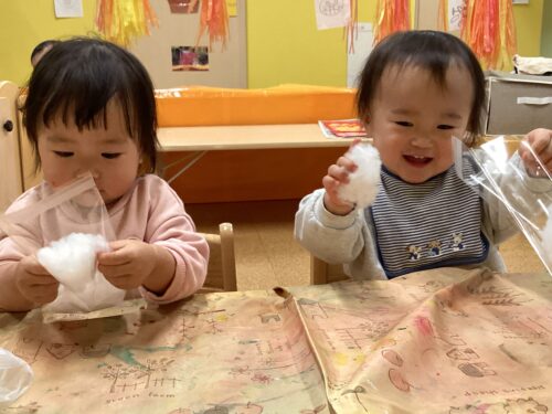 うみ組さんには綿を袋に詰めてもらいました✨ふわふわの綿の感触や袋のクシャクシャという音を楽しみながら、笑顔で取り組む姿が可愛らしいです🥰