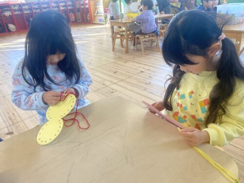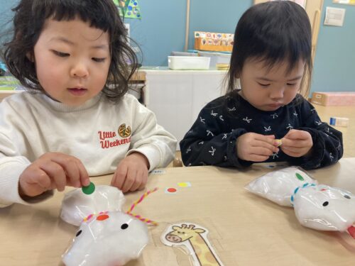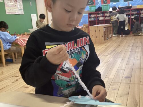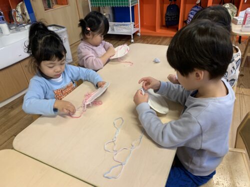 そら組さんとくじら組さんには雪だるまの周りの穴に沿って毛糸通しをしてもらいました❄️細い穴にひとつずつゆっくりと毛糸を通すことができました✨とても真剣な表情で取り組んでくれました😊毛糸を通し終わると、クレパスで雪だるまの顔や体の部分を描いてもらいました!個性溢れる可愛らしい雪だるまが完成しましたよ💕
