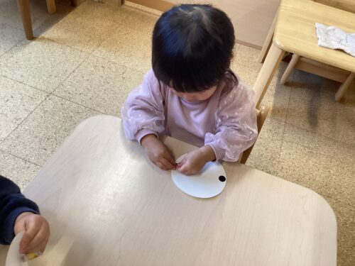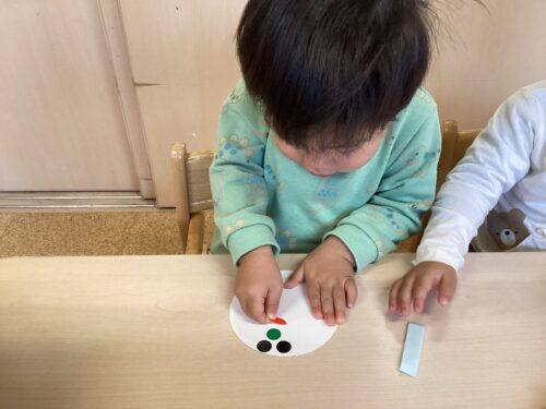 だいち組さんには丸シールで雪だるまの顔パーツを貼ってもらいました♪「おめめはどこかな?」「おくちここにする!」とやり取りも楽しみながら取り組んでくれました✨