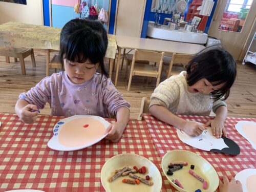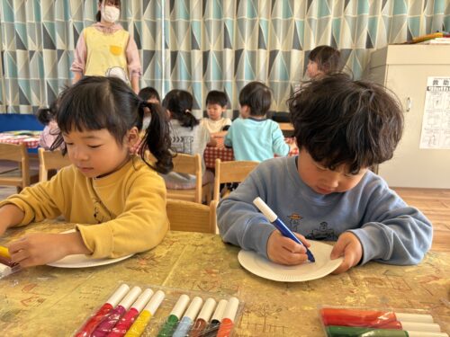 保育士が描いた見本を見ながら、真似して描いていて、全く同じ色で同じ形を描く子もいれば、自分なりに考えてオリジナルで描く子もいて、それぞれの個性溢れる福笑いが完成しました✨
