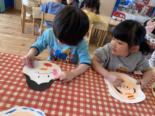 「眉毛がおめめみたいになった〜!」「お鼻ってめっちゃ難しい…」と友達と一緒にお喋りも楽しみながら取り組んでいた子どもたち☺︎