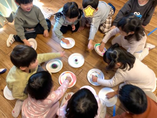 紙皿の真ん中だけでなく「まわりのギザギザのところも色つける!」とこだわって模様づけしている姿も🤭✨