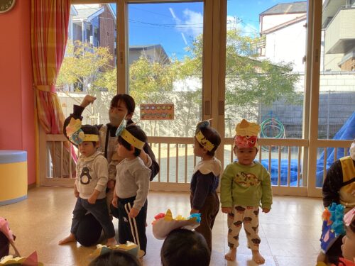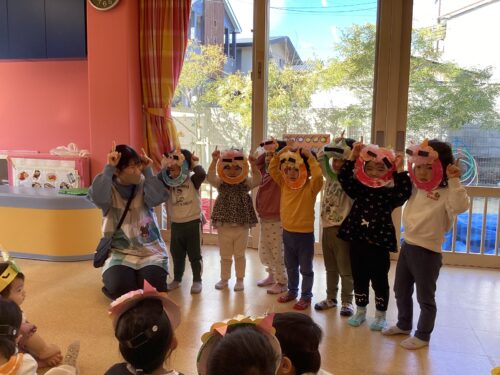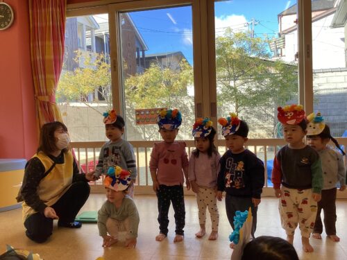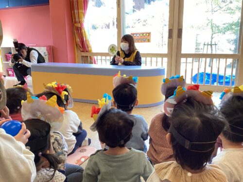 はじめに誕生会の様子をお伝えします!乳児クラスは誕生児がいなかった為、保育士からの出し物「あかいふうせん」のペープサートを見ました😊