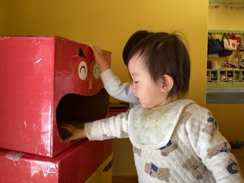 鬼のお口の穴に入れる時には「えいっ!やっ!」と言いながら何度も繰り返し楽しんでいます😆