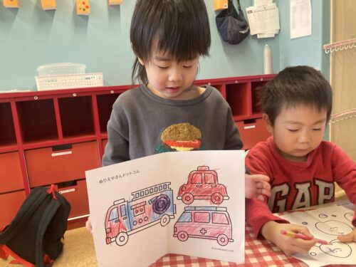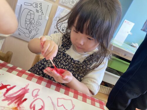 「◯◯くん、りんご塗るわ🍎」、「僕はかっこいい車にする🚗」と自分たちで好きなものを選択しながら上手に塗っていきます!
