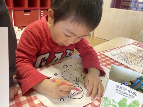 できあがったぬりえはいつも保育士のところまで見せに来てくれます!「上手に塗れたね!」と褒めるとニヤっと可愛らしい表情を見せてくれます😆