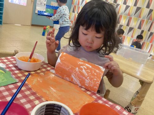「ピンクがいいー💕」、「緑とオレンジ混ぜてみよ〜」と自分の好きな色を選びながら大胆にぬりぬりしたり…