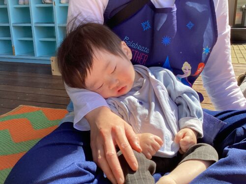 日向ぼっこでは、陽の暖かさを感じながら、保育士のお膝の上でこてっと入眠、、😴☀️