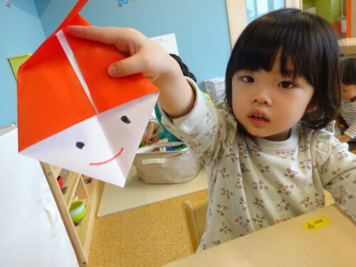 少し難しかったですが、保育士と一緒にサンタクロースを折り、ペンで顔も描きました✨