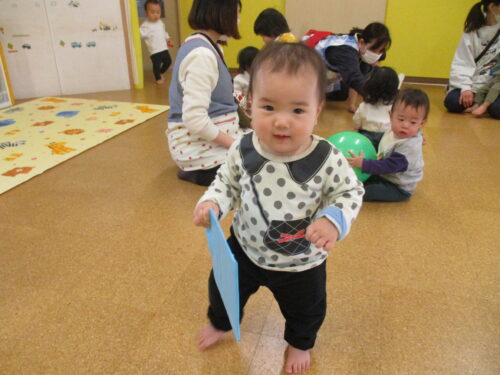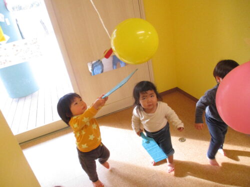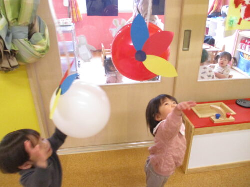すぐに近づいて行って、風船に触れようと両手を伸ばしたり、「ぽん!」「ぱん!」と言いながら、叩いたりと大喜びでした😆