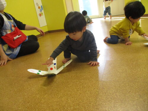 跳ね返ってきた風船に驚きながらも、「ぱん!」「わー!」と声を出しながら風船を叩き、大盛り上がり!夢中になって羽子板を振っていた子どもたちが可愛かったです💛