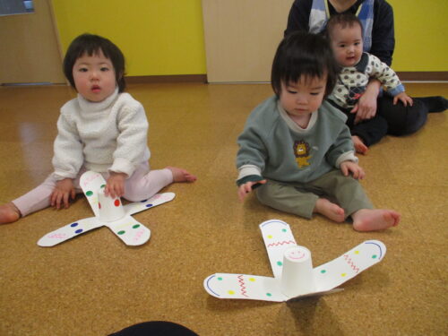牛乳パックや紙皿で作ったコマを使って遊びました。