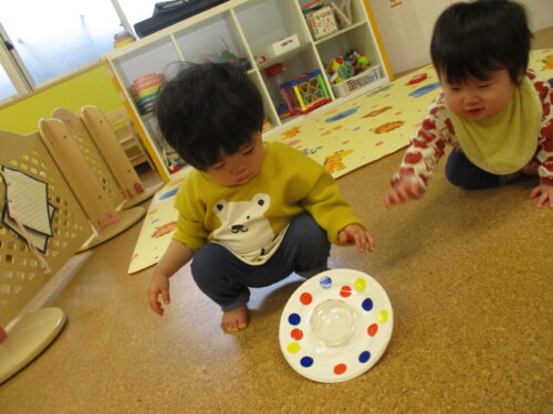 保育士がコマを回すと、くるくる回る様子を不思議そうにじっと見ていました😳