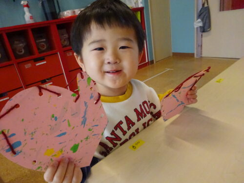 普段の遊びでも紐通しが上手にできるようになったため、製作の中にも取り入れました!