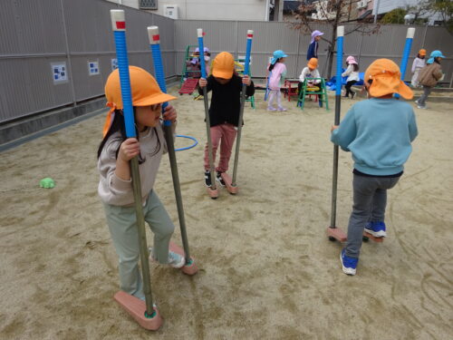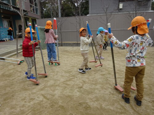 補助なしの竹馬をくじら組のお友だちは挑戦し、乗ることも難しかったのに、何度かするたびに、バランスを掴み、乗れるようになりました。中には5歩くらい歩ける子もいました!さすが✨くじら組さんです。