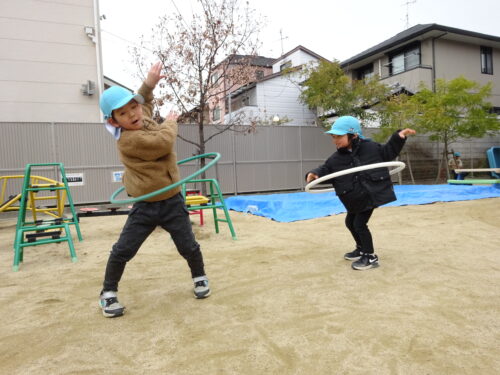 フープも腰で回せるように頑張っている子どもたちです。小さいサイズや大きいサイズがあり、自分がしやすいサイズを選んでいます!