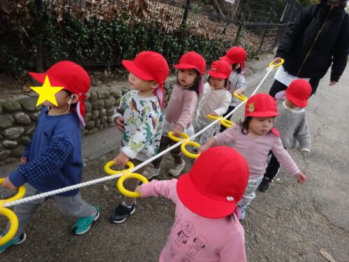 誘導ロープを持ちながらご機嫌に歩く子どもたち♩