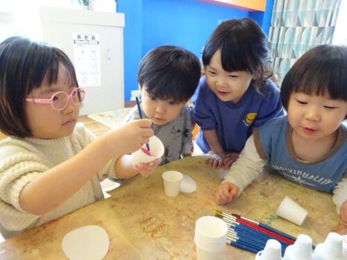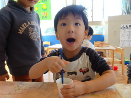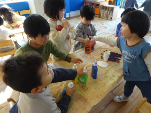 「こんな色になった~!」「見せて!!」「何色と何色混ぜた~?」とみんなで見せあいっこをして楽しんでいましたよ♪