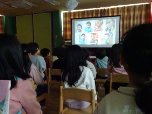 スクリーンに自分が映ると「いたいた!」「覚えてるよ」と小さかった頃の写真を一緒に見ました。