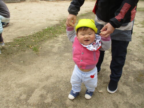 最近は言葉に興味を持つことも増え、花を見て保育士が「綺麗だね」「ピンク色だね」と声を掛けると「綺麗」「ピンク」と同じように言葉にすることを楽しみ、広い場所を見つけると「よーいどん!」と保育士と一緒に掛け声を言い、「ゴー!ゴー!」と元気いっぱいに声を出しながら追いかけっこを楽しんでいました。