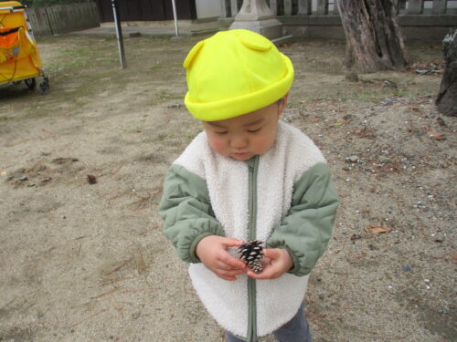 他にも花や松ぼっくり等の自然物にもたくさん触れ、松ぼっくりを両手いっぱいに抱えたり、花に顔を近づけて指先でチョン!と触れてみたりしました🌸