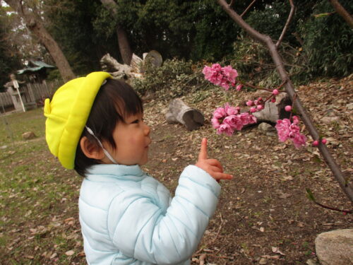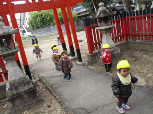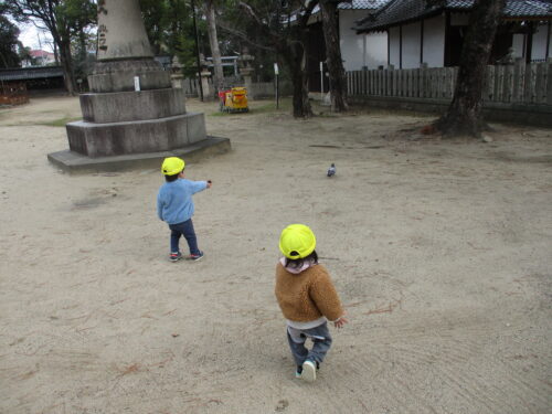 神社に着くと鳩を指さし「待て待て~」と夢中になって追いかけていた子ども達😊