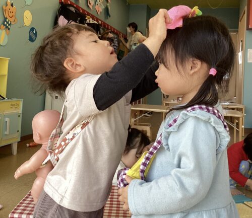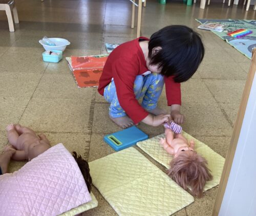 お部屋では赤ちゃんのお世話を楽しんでいる姿があり、靴下を履かせてあげるのにとても真剣な様子で何分も格闘しています☺️