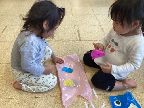 乳児クラスでは、ウロコをペタペタと貼っていきました。