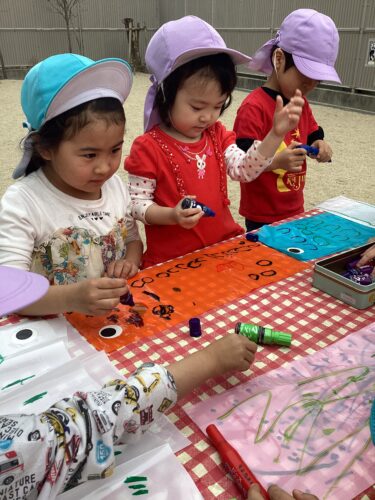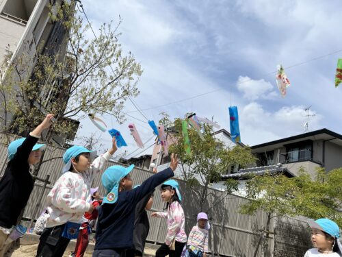 完成した鯉のぼりを園庭に泳がすと、「こいのぼりきれい!」「ほんとにおよいでいるみたい」と喜びの声が沢山聞こえてきました😊