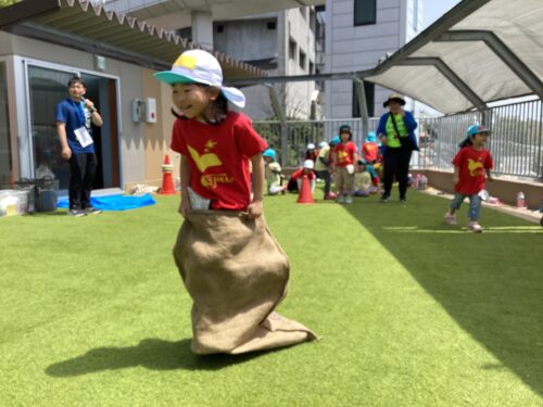 袋に足を入れ、ジャンプしてリレーを繋いで行きました!
