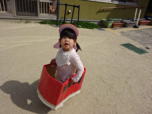 段ボールカーに乗ってみたり、砂遊びやおままごと遊びが好きなだいち組の子どもたちです♪