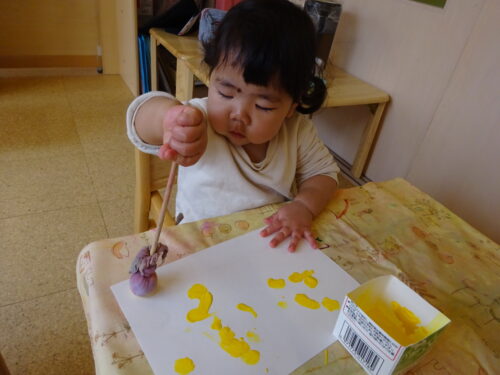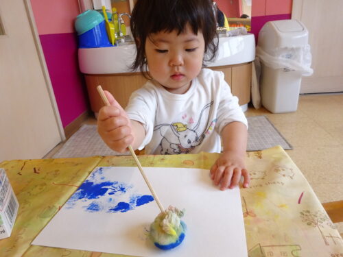 色がなくなってくるとまた絵の具をつけたり、タンポの後ろをちらちら見て気になる様子がありました!完成はまたのお楽しみ🎶