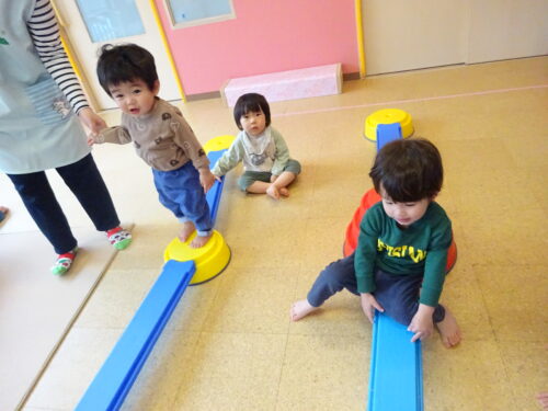 平均台に興味を示し、保育士の手を持ち渡ったり、平均台にまたがってみたりしています☻