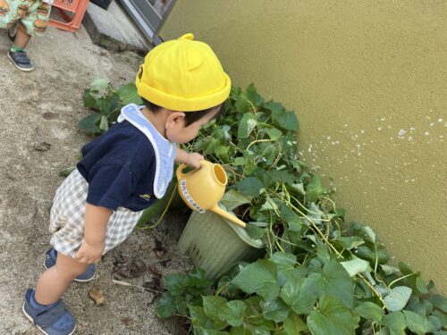 年上のお友だちがさつまいもに水やりをしている姿を羨ましそうに横で見ていると、あめ組のお兄ちゃんお姉ちゃんがジョウロを貸してくれました✨