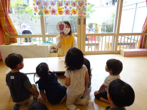 その後は、お誕生日の歌をみんなで唄い、保育士からの出し物「ふうせんのうた」のペープサートを見ました!