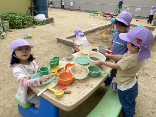 外でリレーの練習をした後は園庭で遊び、存分に楽しんでいます♪