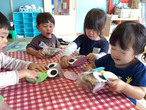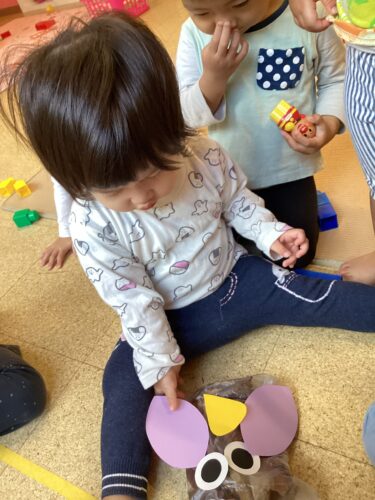 「ふくろうなの?」「目はここにする!」と話しながら貼り、ふくろうの完成です!!