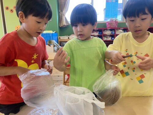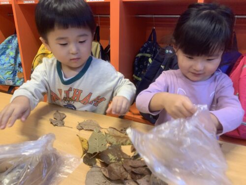 「みどりだね!」「こっちは、茶色だよ!」と、いろんな色の落ち葉を見ながらビニール袋に入れていた子どもたち☺️