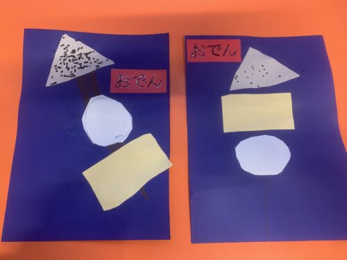 切り終わると縦やななめに線をひいておでんの串を描きます♩