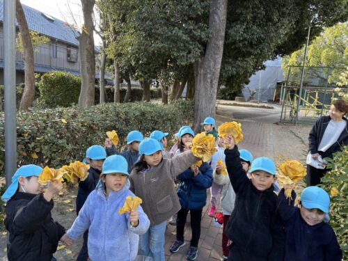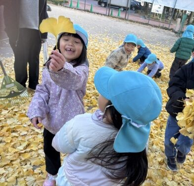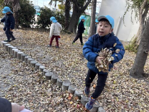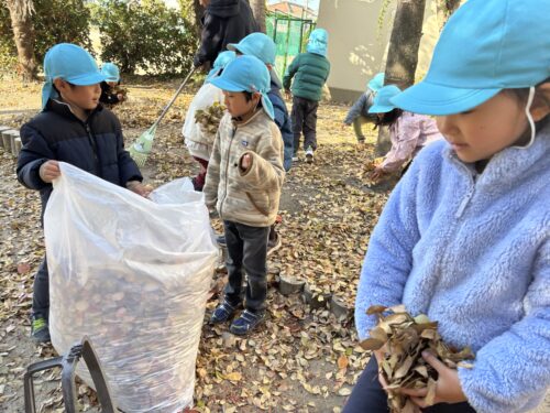 ありがとうの気持ちを込めて、小さな手でたくさんの落ち葉拾いをがんばっています。