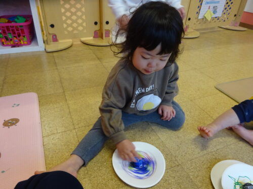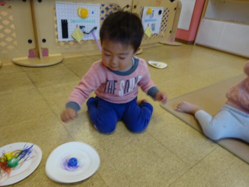 紙皿で作ったコマを使って遊びました!保育士がコマの回し方を伝えると、見様見真似で上手に回し「まわったね~」「せんせいみて~」と嬉しそうな表情を浮かべています😊