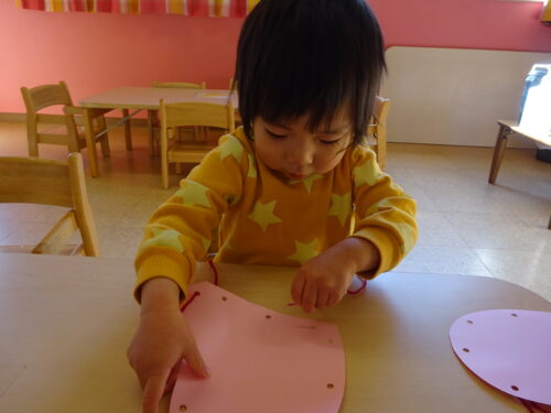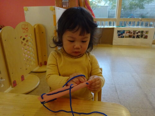 赤色、青色、緑色の中から好きな色を選び、土台の空いた手袋に毛糸を通していきました✨初めは戸惑っている姿がありましたが、やり方を理解すると空いている穴を探し、黙々と毛糸を通していき完成すると「できた~!」と保育士に見せてニコニコです❤😊