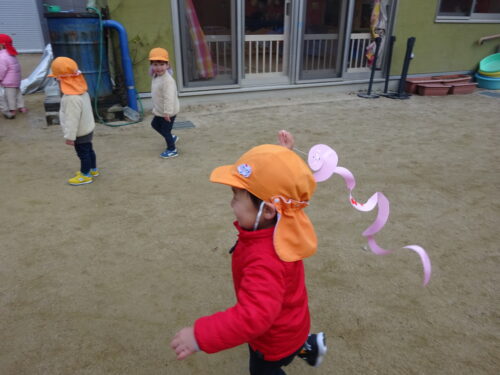 「凧揚げする~?」と聞くと「する~!」と嬉しそうな子どもたち。紐を持ち上手に凧揚げして、お友達と一緒に園庭内を走り回り大盛り上がりです😊