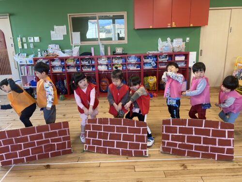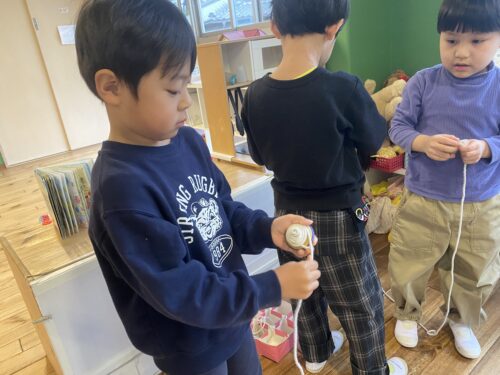 「横から投げたらうまくいった!」や「紐巻いてあげよか?」と友だち同士で