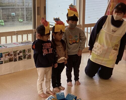 「鬼を退治する時に何ていうか知ってる?」と聞くと「まめ!」や「おにはそと!」と答えてくれました✨