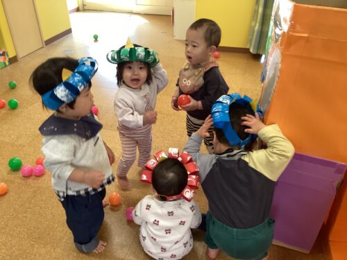 「おにはーそと!ふくはーうち!」と言いながら、ボールを投げたり入れに行ったりしていました☆ボールが入るとニカッと笑ってとても嬉しそうです!